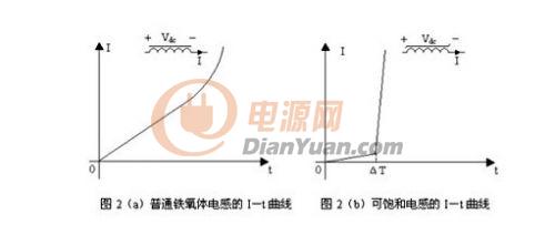普通鐵氧體電感和可飽和電感在直流電壓Vdc作用下的電流強(qiáng)度I隨時(shí)間t變化的曲線如圖2(a)和圖2(b)所示。