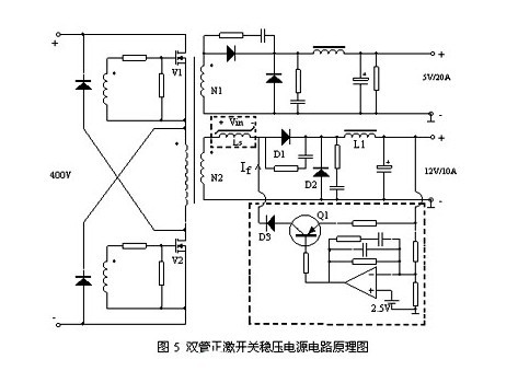磁放大器穩(wěn)壓是利用可飽和電感導(dǎo)通延時(shí)的物理特性來(lái)控制開(kāi)關(guān)電源的占空比和輸出功率,穩(wěn)定電源輸出電壓的一種方法。在可飽和電感上加上適當(dāng)?shù)牟蓸雍涂刂圃?,調(diào)節(jié)其導(dǎo)通延時(shí)的時(shí)間,就可以構(gòu)成最常見(jiàn)的磁放大器穩(wěn)壓電路。圖5是一個(gè)輸入為110Vac~220Vac/50HZ,輸出為5Vdc/20A,12Vdc/10A的雙管正激開(kāi)關(guān)穩(wěn)壓電源,其中5V是主控回路。其輔路12V輸出電流較大,對(duì)穩(wěn)壓精度和負(fù)載穩(wěn)定度都有較高要求,采用普通的方法穩(wěn)壓效果都不是很理想,如果采用磁放大器穩(wěn)壓技術(shù)就可圓滿解決這一問(wèn)題,使穩(wěn)壓電路的結(jié)構(gòu)簡(jiǎn)單,耗散功率小,并可達(dá)到毫伏級(jí)的穩(wěn)壓精度。