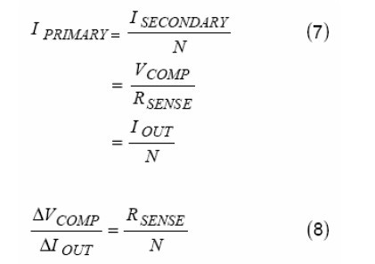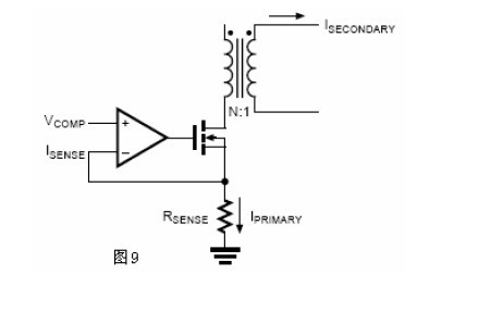 從ISECONDARY以后(見圖9),副邊電流或者說輸出電流與主邊電流成比例,把等式(4)重新排列表示出副邊電流與VCOMP之間的關系。