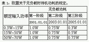 在環(huán)保意識日益受到重視的綠色時代,有效利用有限的能源已經(jīng)成為人們的共識。歐美國家對于電器產(chǎn)品在空載待機時的功耗定義了明確的規(guī)范,歐盟(EEC)公布的具體規(guī)定如表1所示,而在美國方面,從2001年7月起該國就規(guī)定政府機構(gòu)不得購買待機功耗超過1W的電器產(chǎn)品。由此可見,在不久的未來,電源轉(zhuǎn)換器低待機功耗將成為基本要求,這也是電源設(shè)計工程師必須面臨的挑戰(zhàn)。