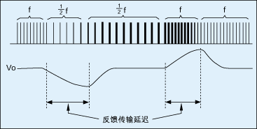 當(dāng)負載降低到一定程度時,脈沖跳躍機制將使有效開關(guān)頻率減半,這意味著轉(zhuǎn)換器供應(yīng)負載的功率減半,因此回掃電路將增加脈沖寬度以補足輸出負載所需要的功率,而在脈沖寬度增加到負載所需功率之前,輸出電壓將產(chǎn)生突降。相反的情形發(fā)生在等效開關(guān)頻率增加時,輸出電壓將發(fā)生突升。這種負載變動時輸出電壓突升與突降是開關(guān)頻率非連續(xù)變動(以整數(shù)倍增加或降低)的必然結(jié)果。