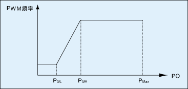 圖4顯示了非導(dǎo)通時間調(diào)制的基本原理。當(dāng)負載改變時,開關(guān)頻率將連續(xù)降低或增加,開關(guān)頻率與輸出功率的關(guān)系如圖5所示。低負載或空載時這種連續(xù)調(diào)變降低開關(guān)頻率的方式除了可以有效降低能量損失外,還可以避免前兩種方法中輸出電壓突升或突降的問題。
