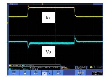 系統(tǒng)的帶寬是影響系統(tǒng)動態(tài)響應(yīng)的重要因素,相位裕度是影響系統(tǒng)穩(wěn)定性的重要因素。如果選擇不同的Rf1,系統(tǒng)的帶寬和相位裕度會產(chǎn)生變化,也就是動態(tài)響應(yīng)和穩(wěn)定性會發(fā)生變化。具體以表1來分析,當(dāng)Rf1從300k變到750k,系統(tǒng)地帶寬從51.1kHz變到26.1kHz,因此系統(tǒng)的動態(tài)響應(yīng)會相應(yīng)的變差,而由于相位裕度都是足夠的,因此系統(tǒng)都處于穩(wěn)定工作的狀態(tài)。圖7和圖8是做負(fù)載切換的動態(tài)響應(yīng)測試結(jié)果,從測試結(jié)果可以看出環(huán)路響應(yīng)速度變慢,導(dǎo)致輸出電壓過沖變大,動態(tài)響應(yīng)效果變差。