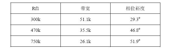 圖5和圖6是用網(wǎng)絡(luò)分析儀進(jìn)行AP3406環(huán)路增益測試的結(jié)果。由圖可以看出,當(dāng)Rf1從300k變化到470k,再變化到750k,系統(tǒng)的環(huán)路增益的幅頻特性不斷向下移動,同時相頻特性基本不變。于是系統(tǒng)的帶寬和相位裕度都有較大改變,測試結(jié)果如表1所示。