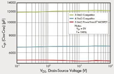 圖8 100V柵-源電容/3.6毫歐PowerTrench MOSFET與競爭產(chǎn)品的比較