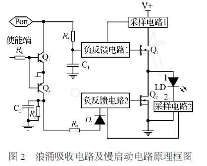 3)采用功率器件(MOS管)開(kāi)通或關(guān)斷來(lái)強(qiáng)制吸收或隔離浪涌,防止浪涌對(duì)半導(dǎo)體激光器損壞。