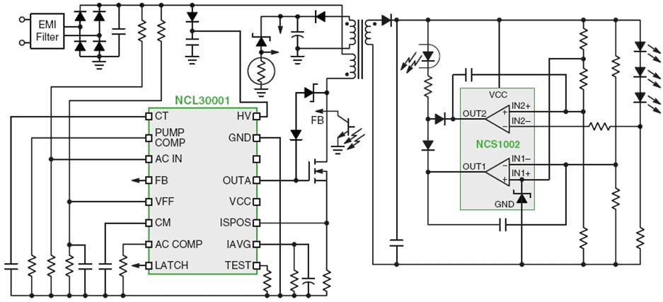 圖4:基于NCL30001 LED驅(qū)動器和NCS1002控制器的90 W LED驅(qū)動器演示板電路。