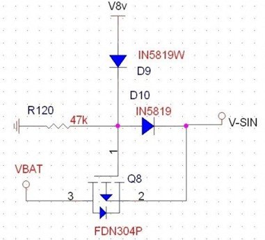 第一種應(yīng)用,由PMOS來進行電壓的選擇,當(dāng)V8V存在時,此時電壓全部由V8V提供,將PMOS關(guān)閉,VBAT不提供電壓給VSIN,而當(dāng)V8V為低時,VSIN由8V供電。注意R120的接地,該電阻能將柵極電壓穩(wěn)定地拉低,確保PMOS的正常開啟,這也是前文所描述的柵極高阻抗所帶來的狀態(tài)隱患。D9和D10的作用在于防止電壓的倒灌。D9可以省略。這里要注意到實際上該電路的DS接反,這樣由附生二極管導(dǎo)通導(dǎo)致了開關(guān)管的功能不能達到,實際應(yīng)用要注意。