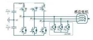 m.d.manjrekar和a.rao等學者提出了一種通過添加輔助零狀態(tài)開關,以消除因零開關狀態(tài)而產(chǎn)生共模電壓的方案,電路結構見圖4所示。這種輔助零狀態(tài)合成器方法在經(jīng)濟方面很有吸引力,并且還可以使消除感應電機側共模電壓。