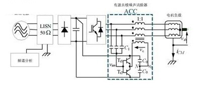 傳統(tǒng)的用于消除共模電壓的有源濾波器如圖8所示,文獻將其稱為有源共模噪聲消除器,acc連接在逆變器的輸出端和三根電纜之間,由共模電壓傳感器、補償電路和共模變壓器組成,acc在逆變器輸出端疊加一個補償電壓,該補償電壓與pwm逆變器產(chǎn)生的共模電壓極性相反、幅值相等,從而使施加在負載上的共模電壓被完全消除,也就減小了共模電流和傳導emi。