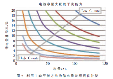 主動(dòng)平衡系統(tǒng)的性能取決于平衡電流與電池充電和放電率之間的比率。電池的不平衡率越高而且充電或放電率越大,所需的平衡電流便越高。主動(dòng)式電池管理系統(tǒng)可以在充電或放電時(shí)為小電池之間的儲(chǔ)電量差額提供補(bǔ)償(假設(shè)采用的平衡電流恒定不變),圖2顯示這個(gè)差額的補(bǔ)償數(shù)值。