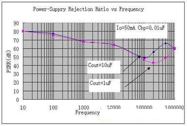 如圖為輸出電容對PSRR的影響。大電容器一般在一定頻率范圍內(nèi)會提高電源抑制比(PSRR)