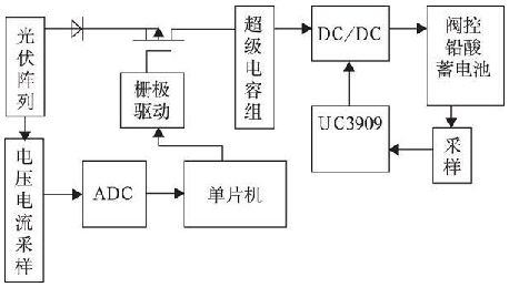由于光伏陣列受外界環(huán)境影響較大, 本系統(tǒng)中12 V的太陽能板輸出電壓的變化范圍約為0~ 20 V,如果直接為鉛酸蓄電池充電, 由于鉛酸蓄電池的正常工作電壓要高于10. 8 V, 因此當弱光條件下, 太陽能板的輸出電壓低于鉛酸蓄電池的端電壓時, 其產(chǎn)生的電能不能被鉛酸蓄電池吸收。因此本系統(tǒng)采用把太陽能板輸出經(jīng)過超級電容器組, 再由超級電容器組先經(jīng)升降壓后為鉛酸蓄電池充電, 有效增強系統(tǒng)弱光充電能力, 提高利用效率。
