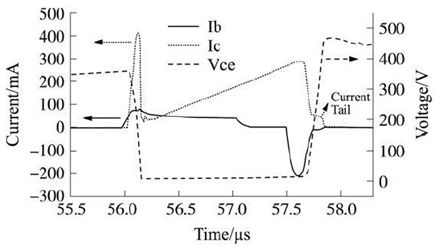 在開(kāi)關(guān)晶體管關(guān)斷時(shí), 集電極電流不能馬上降為0, 而集電極電壓已經(jīng)從Vcesat開(kāi)始上升, 在開(kāi)關(guān)晶體管上產(chǎn)生電壓電流交替現(xiàn)象, 從而產(chǎn)生關(guān)斷損耗。