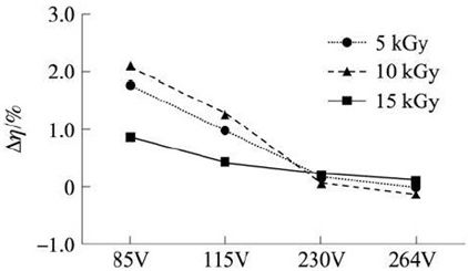 圖3 電子輻照后的APT13003E與常規(guī)的APT13003E在各個(gè)交流輸入電壓下系統(tǒng)平均效率增加百分比[page]