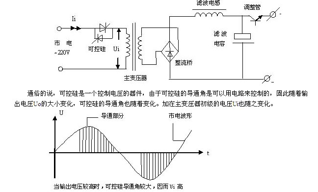 也就是~220V市電經(jīng)可控硅控制后只有一部分加在主變壓器的初級(jí)。當(dāng)輸出電壓Uo較高時(shí),可控硅導(dǎo)通角較大,大部分市電電壓被可控硅“放過(guò)來(lái)了”(如上圖所示),因而加在變壓器初級(jí)的電壓,即Ui較高,這當(dāng)然經(jīng)整流濾波后輸出電壓也就比較高了。