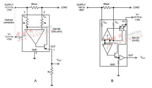 電流分路.是專門用于分路電流檢測的高共模電壓差動(dòng)放大器,能夠解決電阻型差動(dòng)放大器的局限性。電流分路.與差動(dòng)放大器相比的主要區(qū)別在于:其共模電壓功能通常只擴(kuò)展到正電壓,而一些電流分路.允許共模接地。這會(huì)造成更多的衍生情況,我們隨后還要談到。共模電壓功能也允許擴(kuò)展到負(fù)電壓。電流分路.從一開始設(shè)計(jì)時(shí)就是以單電源電壓工作的,通常最低電壓可達(dá) 2.7V。圖 3 顯示了兩類電流分路.,分為電流輸出型分路.和電壓輸出型分路.。電流輸出型分路.通常靜態(tài)電流較低,需要外部輸出電阻,從而使終端用戶能夠設(shè)定增益。電壓輸出器件采用固定增益且不需要其他組件。