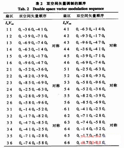 空間矢量調(diào)制法只確定開(kāi)關(guān)間隔中應(yīng)用電壓矢量的占空比,從而獲得低頻率的輸出電壓和輸入電流的平均值,但是并沒(méi)有確定使用的順序。所以需要使用雙空間矢量調(diào)制法,同時(shí)也可改善波形的質(zhì)量。圖2表明了輸入電流在4扇區(qū),輸出電壓在5扇區(qū)應(yīng)用雙空間矢量調(diào)制的順序。電壓矢量在開(kāi)關(guān)間隔中對(duì)稱(chēng)分布,零矢量每4個(gè)開(kāi)關(guān)間隔使用一次。在每次開(kāi)關(guān)轉(zhuǎn)換中只有一個(gè)開(kāi)關(guān)狀態(tài)發(fā)生改變以最大程度地降低損耗。在圖2中通過(guò)表格2確定相應(yīng)開(kāi)關(guān)時(shí)間: