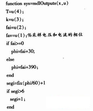 盡管現(xiàn)有的DSP技術(shù)和FPGA技術(shù)處理速度很快,很有效,但矩陣變換器的控制仍非常復(fù)雜,在仿真中,若按傳統(tǒng)方法使用定義好的Simulink模塊,會(huì)非常繁瑣,因?yàn)楸仨氄_的設(shè)置大量的參數(shù),而又沒(méi)有合適的調(diào)試工具。通過(guò)Matlab/Simulink里的功能強(qiáng)大的S函數(shù),S函數(shù)完美地結(jié)合了Simulink框圖簡(jiǎn)潔明快的特點(diǎn)和Matlab編程靈活方便的優(yōu)點(diǎn),可充分利用Matlab提供的豐富資源,調(diào)用各種工具箱函數(shù),實(shí)現(xiàn)模塊所無(wú)法實(shí)現(xiàn)的復(fù)雜功能,從而使問(wèn)題大大簡(jiǎn)化。編程中既可以使用C語(yǔ)言,也可以使用Matlab語(yǔ)言來(lái)實(shí)現(xiàn)空間矢量調(diào)制法。使用后者會(huì)更簡(jiǎn)單些,以下是部分程序: