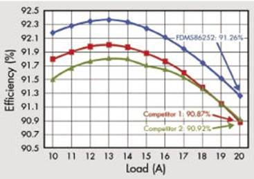 針對于服務器應用和通信應用的高性能電源,在設計過程中有以下三個指標尤為重要:一、如何提高系統(tǒng)的功率密度,二、如何提高系統(tǒng)輕載下的效率,三、如何實現(xiàn)長系統(tǒng)壽命下的高可靠性。圖片所示是在原系統(tǒng)基礎上改用飛兆半導體中等電壓Power Trench MOSFET后在輕載25%狀態(tài)下效率有明顯的提高,大約1%左右。
