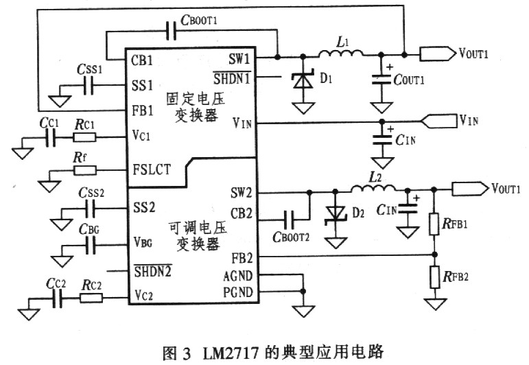 圖3所示是LM2717的典型應用電路。圖中,VIN是整個應用電路的電壓輸入端,VOUT1是固定降壓變換器的電壓輸出端,VOUT2是可調(diào)降壓變換器的電壓輸出端。CIN、Coot、CSS、CBOOT、L分別是輸入電容器、輸出電容器、軟啟動電容器、自舉電容器、電感,這幾個元件在設(shè)計時應著重考慮。這里主要介紹利用該電路進行設(shè)計時一些主要外元件的選擇原則及需注意的問題。