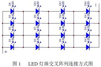 從圖中可以看出當其中個別LED 短路或斷路,也不會引起整個燈組熄滅。這種交叉陣列連接方式具有線路簡單,亮度穩(wěn)定,可靠性高,對驅(qū)動要求較低等特點。