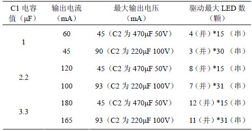 C1 為降壓電容,電容降壓電路輸出電流主要與降壓電容容量和輸出電壓有關(guān),輸出電壓越高電流越小。理論上驅(qū)動電路輸出電壓可以達100 V 以上,但考慮到高電壓下濾波電容C2 的體積較大,不易于電路安裝,本文設(shè)計的驅(qū)動電路主要使用50 V和100 V 的濾波電容。雖然電容容值越大驅(qū)動電路輸出電流越大,但降壓電容值太大會降低整個驅(qū)動電路的安全特性與穩(wěn)定性,因此建議降壓電容的容值不要超過3.3 μF。下表1 給出了采用0.68~3.3 μF不同大小降壓電容,驅(qū)動電路在不同電壓下提供的電流以及能夠驅(qū)動的最多LED 數(shù)量。(此表中的數(shù)據(jù)為多次實驗與仿真所得)
