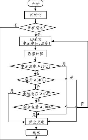 采用充電限壓,電池溫升檢測策略,如蓄電池電36 V,充電截止電壓42.5-43 V,充電截止溫度80℃,充電截止溫升30℃。不過絕大部分時間蓄電池基本處于欠充狀態(tài)。同時通過對電池電壓的數(shù)據(jù)實時采集,利用軟件控制對電池采取限壓保護:通過實時計算電池電量進行防過充過放保護,電量為100%時停止充電,電量為20%時停止放電,為延長其壽命,做了第二道防線。圖1 為蓄電池過充保護流程圖。