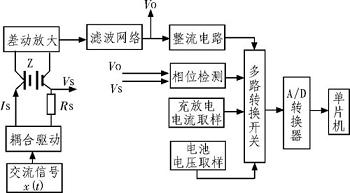 給電池施加一個固定頻率和固定電流(日前一般使用l kHz頻率、50 mA小電沆),然后對其電壓進行采樣,經(jīng)過整流、濾波等一系列處理后通過運放電路計算出該電池的內阻值。圖4為在線測量剩余電量硬件框圖。