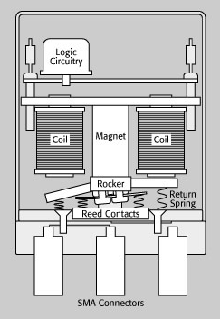 繼電器內(nèi)的容性是限制開(kāi)關(guān)的信號(hào)頻率的常見(jiàn)因素。繼電器的材料和物理特性決定了其構(gòu)成的內(nèi)部電容。比如,在超過(guò)40GHz的射頻和微波開(kāi)關(guān)中,在機(jī)電繼電器中采用了特殊的接觸架構(gòu)來(lái)獲得更好的性能。圖1顯示了一個(gè)典型的構(gòu)造,共同端接位于兩個(gè)開(kāi)關(guān)端接之間。所有信號(hào)的連接線路都是同軸線,來(lái)保證最佳的信號(hào)完整性(SI)。在這種情況下,連接器是SMA母頭。對(duì)于更加復(fù)雜的開(kāi)關(guān)結(jié)構(gòu),共同端接被各個(gè)開(kāi)關(guān)端接以放射狀圍繞。