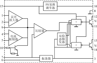 圖2所示為SG3524的結(jié)構(gòu)框圖和引腳圖。