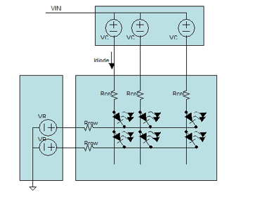 其中:V二極管是二極管的前向壓降;I二極管是流經(jīng)二極管的電流;Rcol是列連接的電阻;Rrow是行金屬的電阻;VCD是列驅(qū)動(dòng)器所需的開銷;VRD是行驅(qū)動(dòng)器所需的開銷;在典型應(yīng)用中,VIN大約為20V。