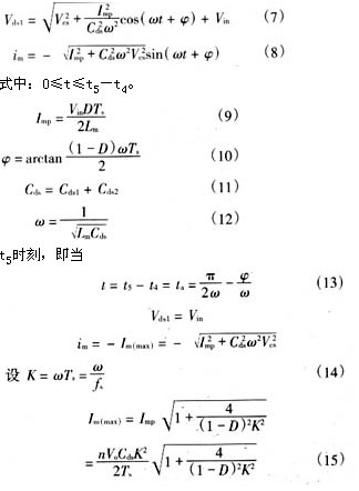 從上面的分析可明顯地看出,當(dāng)變壓器勵(lì)磁電感l(wèi)m減小,勵(lì)磁電流足夠大時(shí),[t5~t0′]期間勵(lì)磁電流除了能提供負(fù)載電流外,剩余部分可用來(lái)幫助電容cds2、cds1充放電。電壓vds1有可能諧振到零,從而實(shí)現(xiàn)主功率開(kāi)關(guān)管s的零電壓軟開(kāi)通。二極管d1可為負(fù)的勵(lì)磁電流續(xù)流。關(guān)鍵工作波形如圖2(b)所示,具體的軟開(kāi)關(guān)條件將在下一節(jié)中詳細(xì)討論。很顯然,軟開(kāi)關(guān)的代價(jià)是變壓器勵(lì)磁電流和開(kāi)關(guān)管導(dǎo)通電流峰值大幅增加,開(kāi)關(guān)管及變壓器電流應(yīng)力和通態(tài)損耗明顯加大。