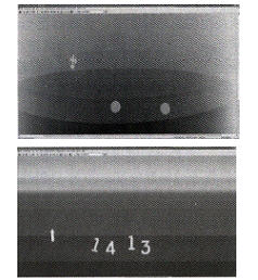 在進(jìn)行圖像尺寸測(cè)量時(shí),需要將經(jīng)過計(jì)量或已知精確尺寸的試件緊貼在被檢焊縫的一側(cè)與焊縫同時(shí)成像。每次評(píng)定前,應(yīng)作一次標(biāo)定,缺陷測(cè)量時(shí)進(jìn)行對(duì)比或通過公式將圖像尺寸轉(zhuǎn)化為真實(shí)尺寸。為此,設(shè)計(jì)了專用的測(cè)量評(píng)片用試片(圖3),試片也可用于檢測(cè)相對(duì)運(yùn)動(dòng)速度是否匹配。