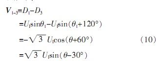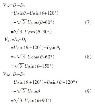 由于自整角機(jī)中定子繞組為星型連接,彼此在空間上呈120°,并且輸出三路定子繞組電壓D1、D2、D3是相對于中心點而言,無法對其單獨(dú)處理。由公式(5)可知,其任意兩線間電壓為: