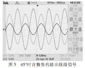 根據(jù)圖中所示,在確定的角度下,自整角機(jī)三路線線信號在電壓上呈120°正弦關(guān)系,接口電路轉(zhuǎn)換輸出信號為兩路電壓正交信號,根據(jù)角度不同,兩路信號電壓峰值不同,單路最大時電壓為2Vrms。測試結(jié)果完全符合設(shè)計要求。