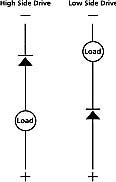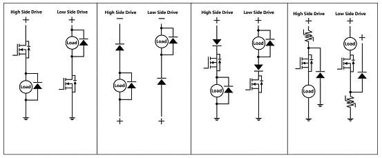 對(duì)于將大功率MOSFET用于各種負(fù)載的固態(tài)開(kāi)關(guān)動(dòng)作的電子模塊,其他極性接反的情況主要集中在驅(qū)動(dòng)配置的高壓側(cè)或低壓側(cè)(見(jiàn)圖3a)。在極性接反的狀態(tài)下,大功率MOSFET的內(nèi)在二極管變?yōu)檎蚱?,并允許電流能夠流至與其連接的電機(jī)、燈或電磁閥負(fù)載(見(jiàn)圖3b)。