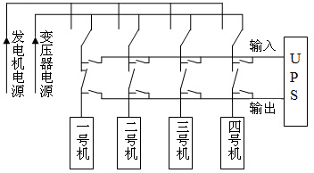 本系統(tǒng)主要是利用現(xiàn)有發(fā)電機(jī)組在不停機(jī)的情況下進(jìn)行雙電源切換。原來電源切換是在主供電回路上通過一個(gè)雙頭刀閘切換,現(xiàn)在將用電系統(tǒng)分割成四個(gè)單元,在每個(gè)分路上各安裝一個(gè)雙頭刀閘,分別對(duì)假捻機(jī)進(jìn)行逐臺(tái)切換。雙頭刀閘切換是人工操作,刀閘在轉(zhuǎn)換過程中會(huì)出現(xiàn)瞬間斷電現(xiàn)象,這樣就會(huì)造成假捻機(jī)停機(jī),這是電源切換不能連續(xù)生產(chǎn)的原因,解決這個(gè)問題是本方案設(shè)計(jì)關(guān)鍵。所以,在電源切換前先將要切換電源假捻機(jī)的電加熱和風(fēng)機(jī)停下來降低負(fù)荷,然后將不間斷電源UPS串聯(lián)在要切換的電路中,雙頭刀閘轉(zhuǎn)換時(shí)用UPS的電池組為假捻機(jī)提供傳動(dòng)系統(tǒng)的電源,就不會(huì)出現(xiàn)斷電現(xiàn)象,可以對(duì)該假捻機(jī)進(jìn)行電源切換。切換完成后將UPS退出供電系統(tǒng),再將電加熱和風(fēng)機(jī)開啟,這樣就完成了一臺(tái)假捻機(jī)的切換。再進(jìn)行下一臺(tái)的切換,以此循環(huán)便可完成全部假捻機(jī)的切換(圖2)。