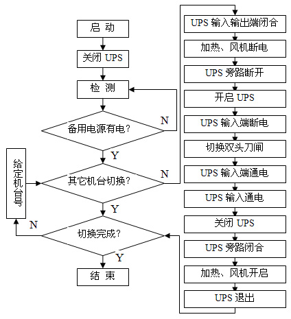 UPS的功率小于假捻機(jī)運(yùn)行負(fù)荷,在外部旁路開關(guān)斷開前,必須將電加熱和風(fēng)機(jī)電源斷開,降低負(fù)荷,保證UPS的安全運(yùn)行。否則系統(tǒng)負(fù)荷大于UPS功率的2倍,UPS自動(dòng)斷電自我保護(hù),造成切換中的假捻機(jī)斷電停機(jī),切換失敗。電加熱和風(fēng)機(jī)電源斷開后,斷開外部旁路開關(guān),UPS已加入到供電系統(tǒng)中,開啟UPS。為了延長雙頭刀閘的使用壽命,使刀閘在不帶負(fù)荷的情況下進(jìn)行切換,雙頭刀閘切換前,將UPS的輸入端電源斷開, 此時(shí)切換中的假捻機(jī)已經(jīng)與外部供電系統(tǒng)全部斷開,假捻機(jī)傳動(dòng)系統(tǒng)由UPS電池組為其提供動(dòng)力電源,維持假捻傳動(dòng)系統(tǒng)的正常運(yùn)轉(zhuǎn),此時(shí)雙頭刀閘已經(jīng)空載,便可在無負(fù)荷的情況下順利切換。切換完成后,接通UPS輸入端電源,為UPS供電的電源已經(jīng)更換為備用電源,電源切換完成。UPS關(guān)機(jī)后再接通外部旁路開關(guān)、電加熱和風(fēng)機(jī)電源,將UPS的輸入輸出端接觸器斷開,UPS退出切換系統(tǒng),這樣一臺(tái)假捻機(jī)的雙電源切換已完成,再進(jìn)行下一臺(tái)假捻機(jī)的切換。