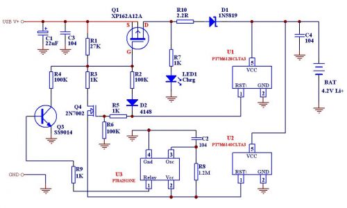 乍看之下,這個方案采用了三個IC,可是U1和U2是采用的SOT-23或者TO-92封裝,就好像普通三極管一樣,其價格也就是2-3個三極管的價格,而U3(PT8A2513NE)也是采用的TO-94封裝,外形和三極管很相似,價錢也相當(dāng)便宜,不過,這個電路可以實現(xiàn)智能判斷電池是否過放電,決定是否在開始充電時采用小電流預(yù)充,另外,采用U3后也將充電后期的補充充電過程延長到大約一個小時!