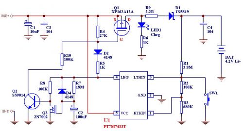 其工作流程大致是:當(dāng)接上Li+電池和供電電源時,IC通過R1/R2/R3組成的網(wǎng)絡(luò)檢測電池電壓,如果電池電壓低于3.3V(由R1-R3的電阻值決定),或者按下按制SW1,此時IC3腳的電壓低于615mV,則IC4腳輸出低電平,通過R5/D2拉低Q1的柵極使之導(dǎo)通,從而通過Q1/R9/D1給電池進行大電流充電,當(dāng)電池電壓一路上升直至超過4.20V,此時IC的1腳電壓高過615mV,IC內(nèi)部經(jīng)簡單判斷和延時,令4腳輸出高電平,從而關(guān)閉大電流充電通道,但是4腳的高電平同時給R7/C2的充電回路供電,令到Q3的柵極電壓慢慢升高,并給R8提供通路導(dǎo)致Q2導(dǎo)通,通過R10給Q1提供一個較弱的導(dǎo)通電流,使之微微導(dǎo)通,從而為電池提供一個較少的補充充電電流。按照圖中所示元件參數(shù)將于大約十分鐘后,由于C2的不斷充電,其端電壓即Q3的柵極電壓不斷上升直至使Q3導(dǎo)通,從而關(guān)閉Q2,令到整個充電過程結(jié)束。
