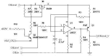 圖中CELLn為第n節(jié)單體電池的電壓,該電路可以對多串電池組的電壓進行測量,并且不受串聯(lián)節(jié)數(shù)的限制,而對串聯(lián)電池組中的第一節(jié)單體電壓不用采用該電路測量,可直接測量或者通過電阻分壓得到。該電路的工作原理如下:在電路正常工作時,運放處于放大狀態(tài),運放的1、3腳為虛短虛斷狀態(tài),即3腳的電壓等于CELLn+1端的電壓,而由于運放的輸入阻抗非常大,因此電阻R3上的電流可忽略,在電阻R1上就是一節(jié)單體電池的電壓,流過電阻R1的電流大小為: