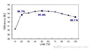 轉換器的效率如圖 7 所示,在額定負載為 20%、50% 和 100% 的情況下測得的效率分別為93.7%、94.6% 和 93.1%,這顯示了邊際性能,因而使用設計優(yōu)良的 PFC 和 DC-DC 級能夠達到85 PLUS 規(guī)范要求。