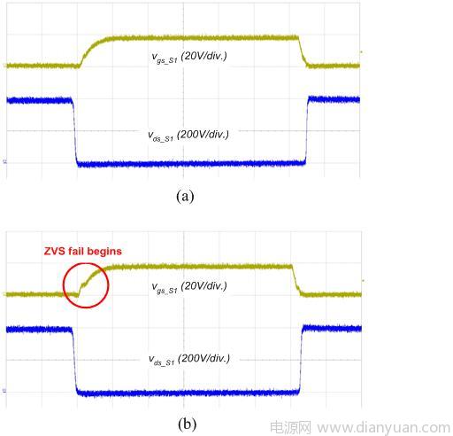 圖6 ZVS 運作驗證;(a) 30% 負載;(b) 20% 負載狀況