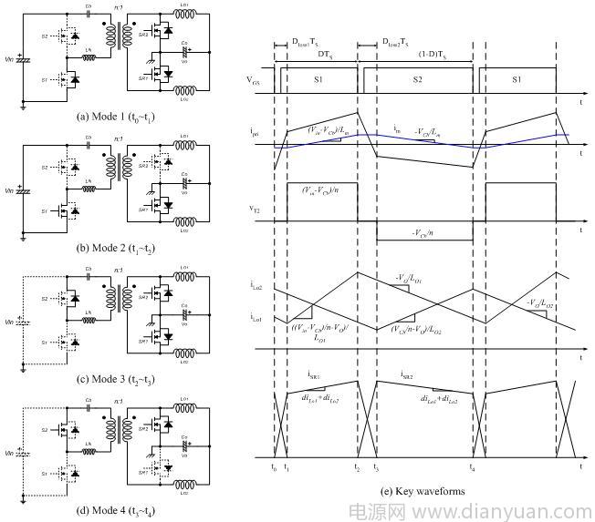 當 S2 關斷,模式 1 作為另一個重建模式而開始,模式 1 的運作原理幾乎與模式 3 相同,只有 ZVS 狀況例外。在模式 1 中,當 S1 的輸出電容電壓等于 Vin-VCb 的瞬間,vT1 成為零。在這個瞬間之前,輸出電感 LO2 上的負載電流反射到變壓器的初級端,有助于實現(xiàn)開關的 ZVS 運作。與此相反,存儲在漏電感中的能量僅在這個瞬間之后對輸出電容進行放電和充電。因而,S1的 ZVS 運作較 S2 更為穩(wěn)固,因為通常 Vin-VCb 高于 VCb ,除此之外,可以與模式 3 相同的方式進行分析,模式 1 的延續(xù)時間為
