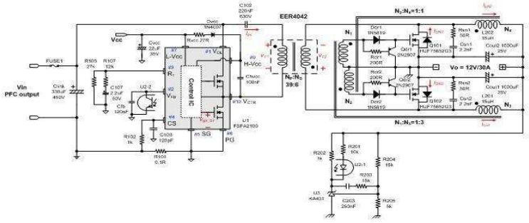 在本節(jié)中討論一個設計示例,目標系統(tǒng)是輸出電壓為 12V 和輸出負載電流為 30A 的 PC 電源,由于輸入通常來自功率因數(shù)校正 (PFC) 電路,輸入電壓的范圍并不寬泛,目標規(guī)范如下: