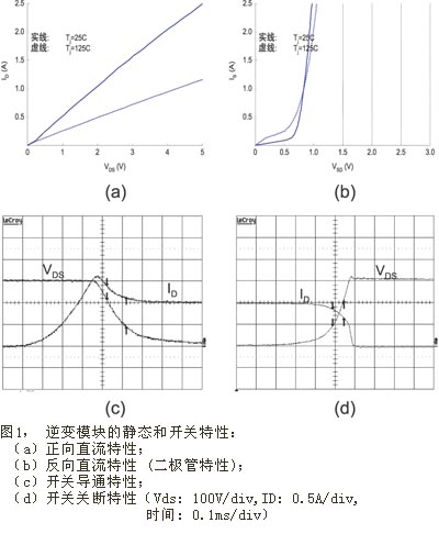 對于小型電機驅(qū)動系統(tǒng),MOSFET在功耗、成本和性能方面較其它功率開關(guān)管更具優(yōu)勢。MOSFET的正向特征電阻為歐姆級 (見圖1(a)) ;其導(dǎo)通損耗與漏極電流的平方成正比,當(dāng)漏極電流低于1A時,其導(dǎo)通損耗低于額定功率相同的IGBT的導(dǎo)通損耗,這是因為IGBT在通態(tài)時存在閾值電壓,該電壓隨逆變輸出功率的下降而顯著增加。大多數(shù)空調(diào)使用的風(fēng)扇電機功率在50W以下;在這個功率級別上,基于MOSFET的逆變器的效率高于IGBT。