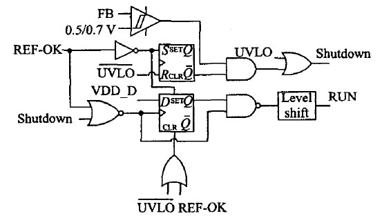 模式控制邏輯用以保證在進(jìn)行模式選擇時(shí),電源系統(tǒng)正常工作。當(dāng)FB電壓底于0.5 V時(shí),該控制邏輯通過(guò)內(nèi)部電流滯回比較器自動(dòng)選擇進(jìn)入待機(jī)模式。RUN信號(hào)(其為高電位有效)用來(lái)關(guān)斷綠色多模式反激變換器中的其它控制模塊,以實(shí)現(xiàn)低待機(jī)功耗。