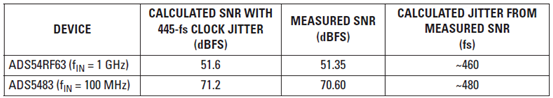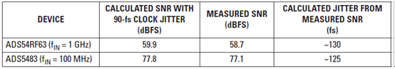 利用調(diào)節(jié)后的相位噪聲曲線圖,計(jì)算得抖動(dòng)較好地匹配了 SNR 測(cè)量結(jié)果,其在 ADS54RF63 和 ADS5483 的 10 到 30 fs 范圍內(nèi)(參見(jiàn)表 8)??紤]到在第三諧波周圍可能存在相位噪聲的較小時(shí)鐘抖動(dòng)影響,該計(jì)算得 SNR 只是一種非常接近的估算結(jié)果。