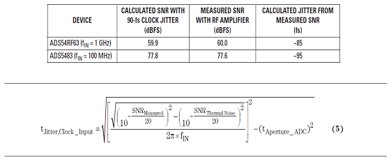 通過(guò)在時(shí)鐘輸入通路中安裝低噪聲 RF 放大器,兩個(gè)數(shù)據(jù)轉(zhuǎn)換器重復(fù)進(jìn)行了高輸入頻率的 SNR 測(cè)量,其結(jié)果如表 5 所示。我們可以看到,測(cè)得 SNR 和預(yù)計(jì) SNR 匹配的非常好。使用下面的方程式 5,計(jì)算得到的時(shí)鐘抖動(dòng)值在 90-fs 時(shí)鐘抖動(dòng)的 5 fs 以內(nèi),其結(jié)果通過(guò)相位噪聲測(cè)得推導(dǎo)得出。